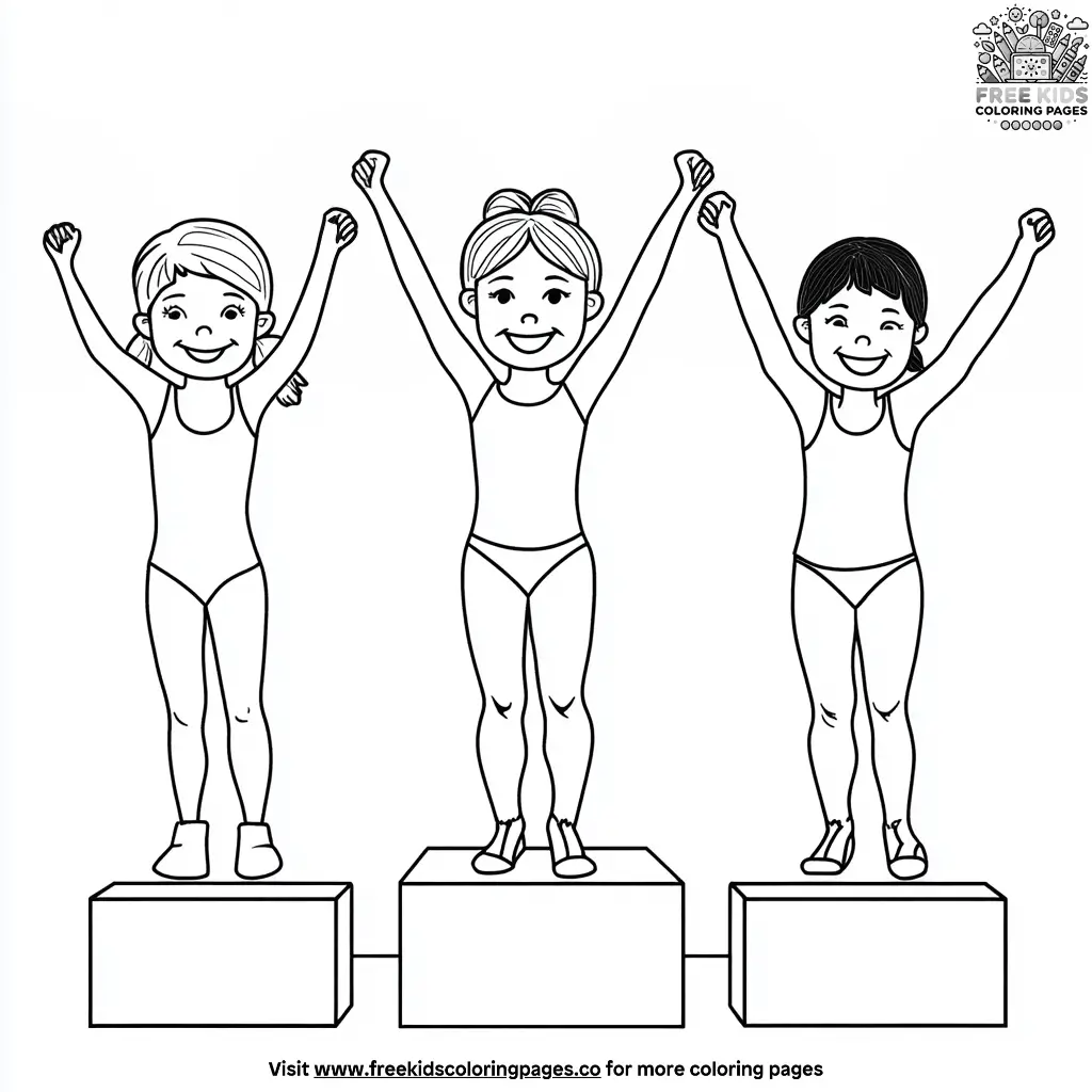The Victory Podium Gymnasts Coloring Pages depict three gymnasts on a victory podium, celebrating their achievements with medals and festive decorations.